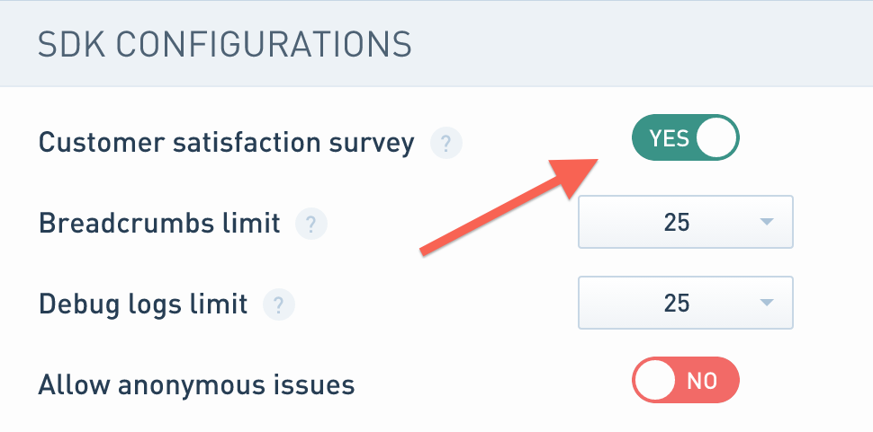 To enable it, go to Settings in your agent dashboard, and then under app settings, select your app. You can enable Customer satisfaction survey from under SDK Configurations.