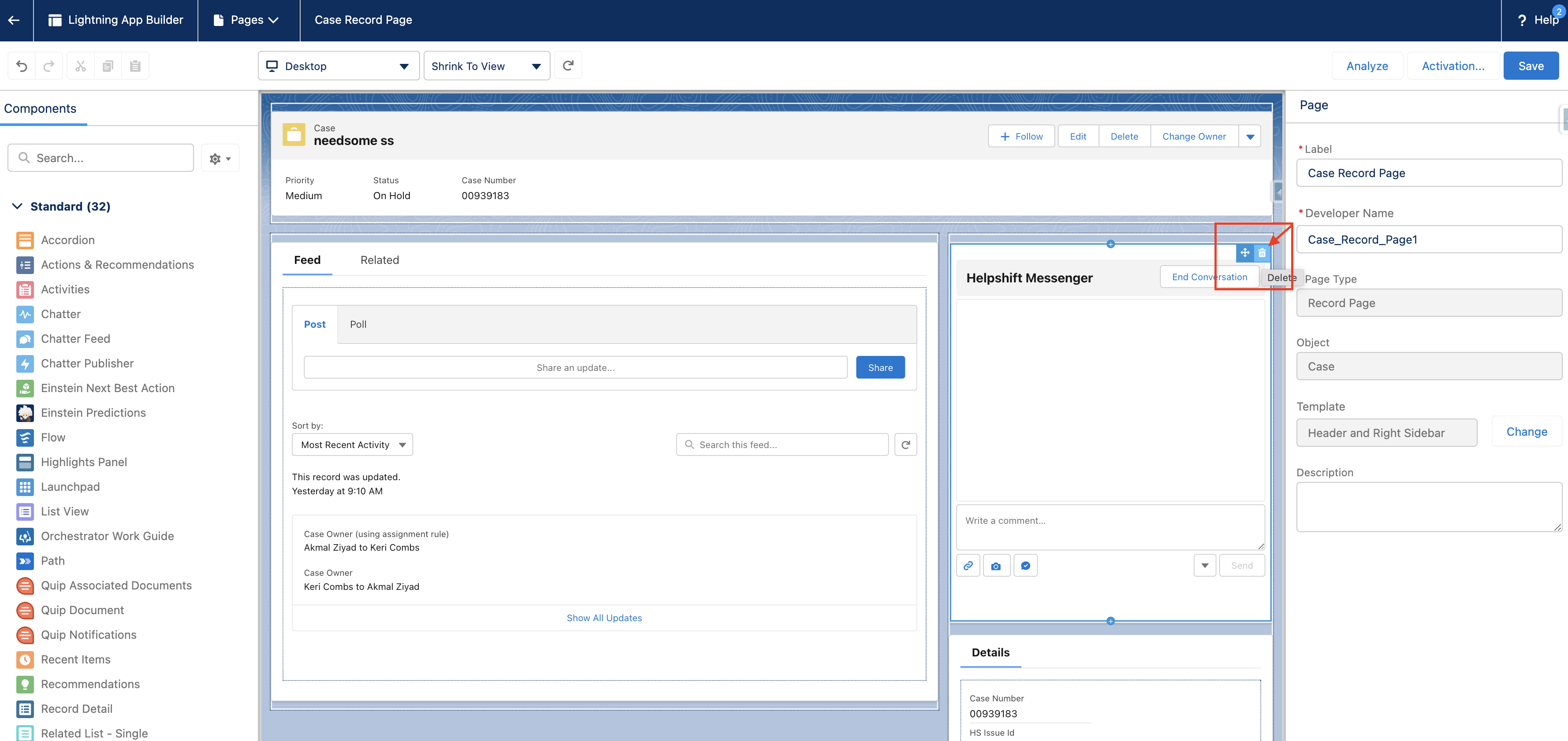 - Manually add the new Helpshift Messenger to the case record page. (Steps for this are described in the next section.)