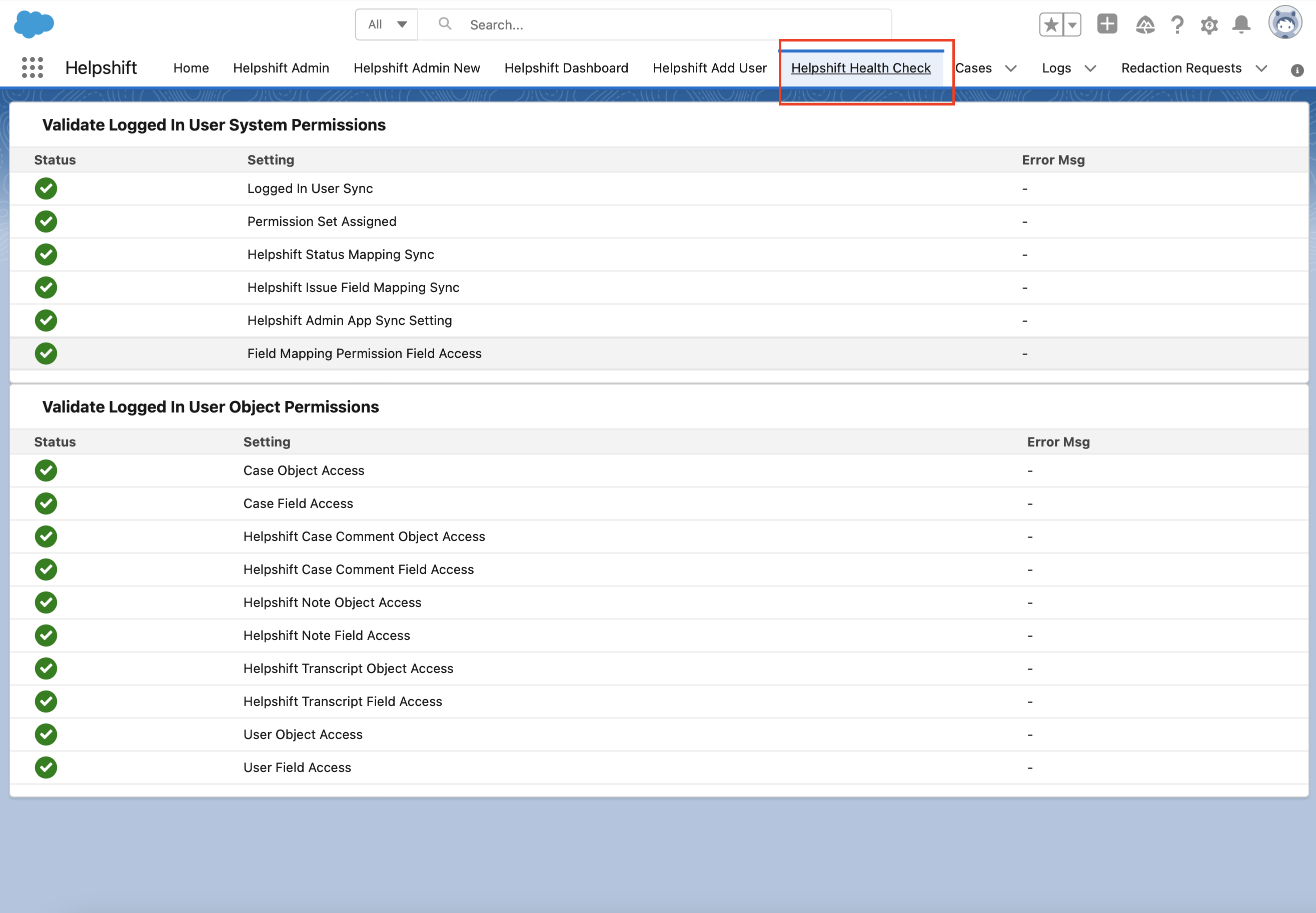 - Click on the Helpshift Health Check tab and ensure there are no errors