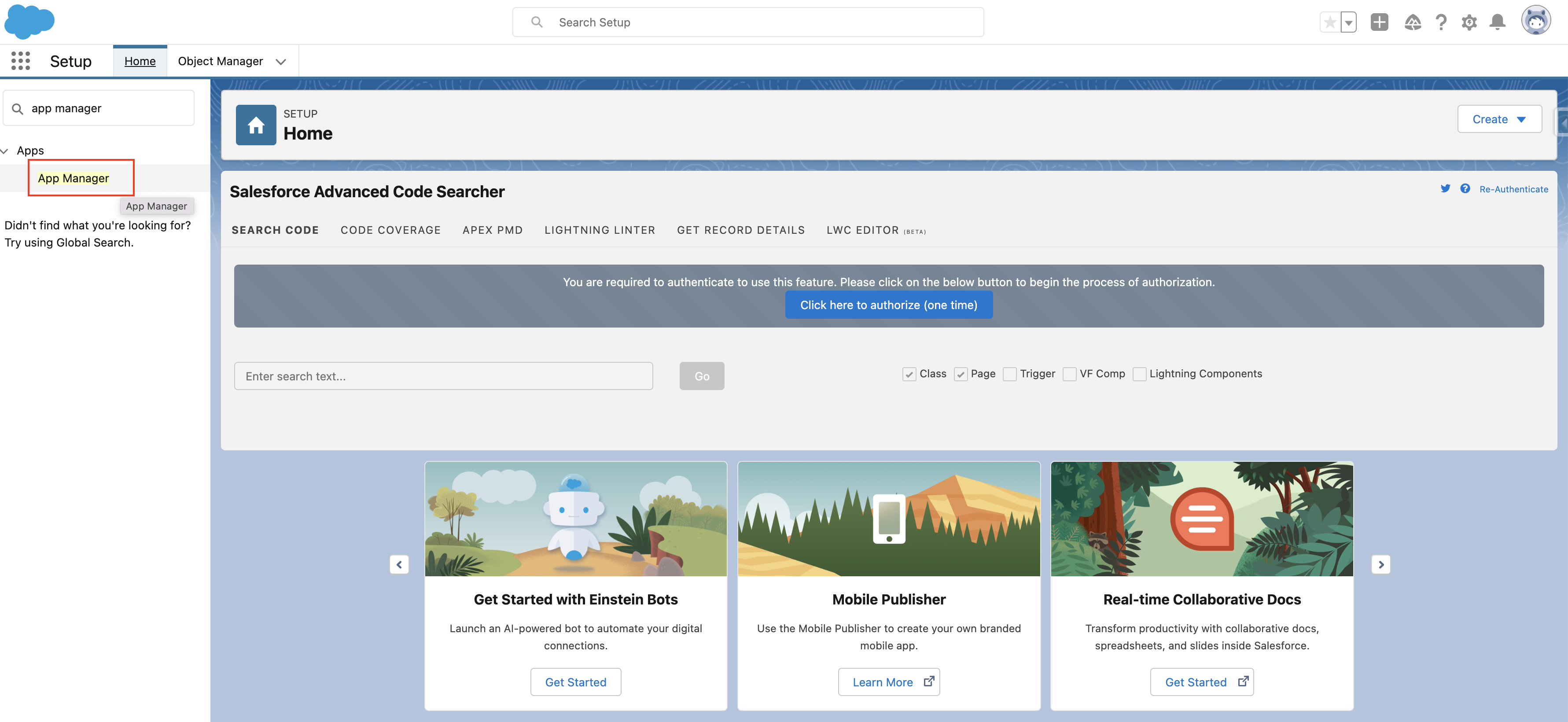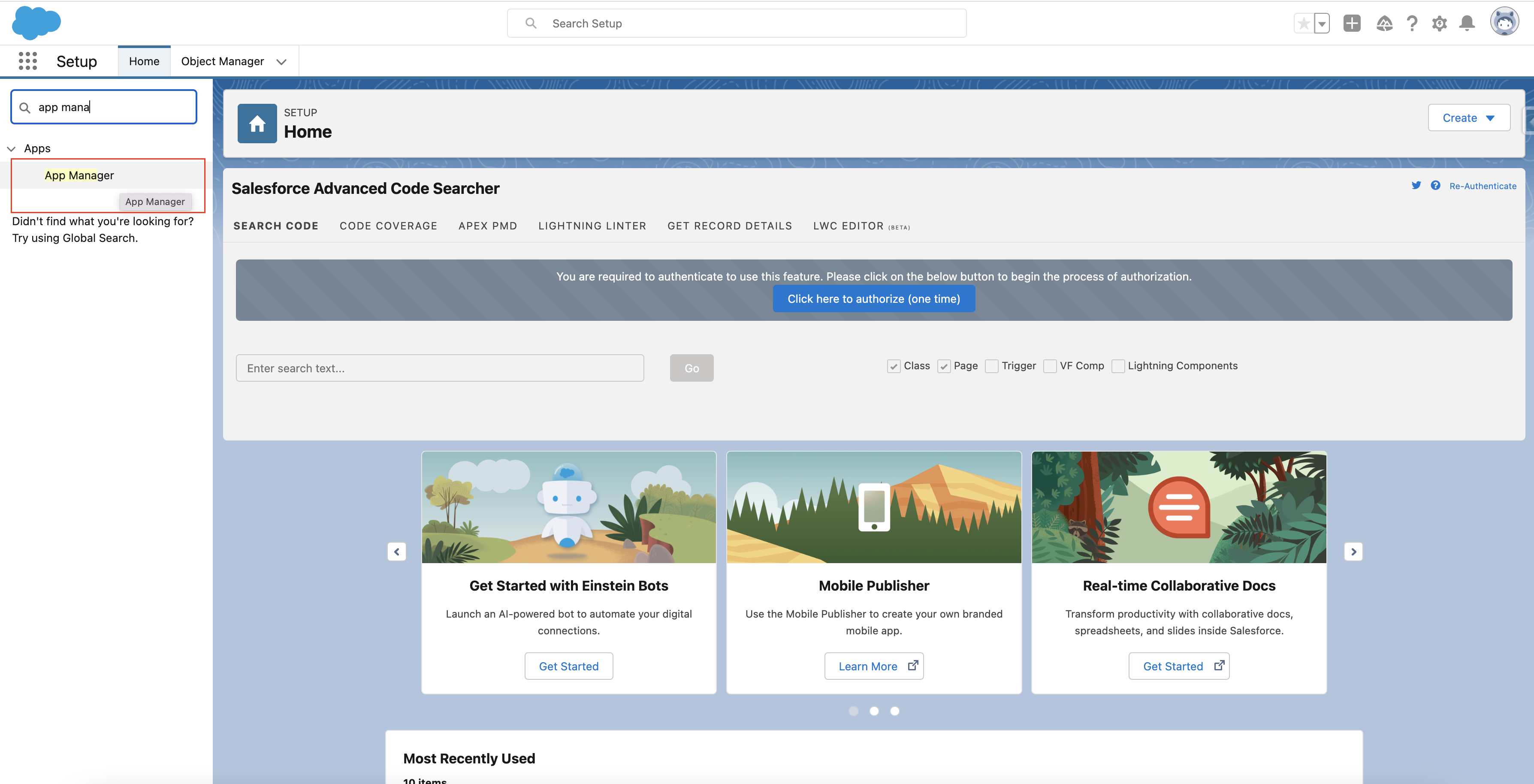 - Navigate to Setup and search for App Manager.